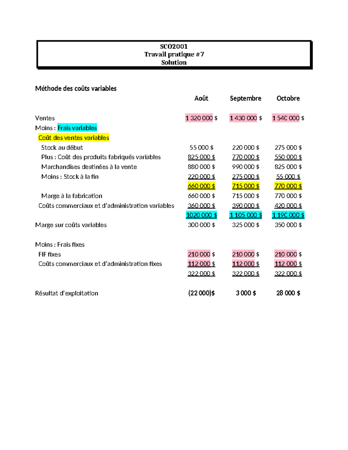 SCO2001 TP7 Solution: Méthode des Coûts Variables et Résultats - Studocu