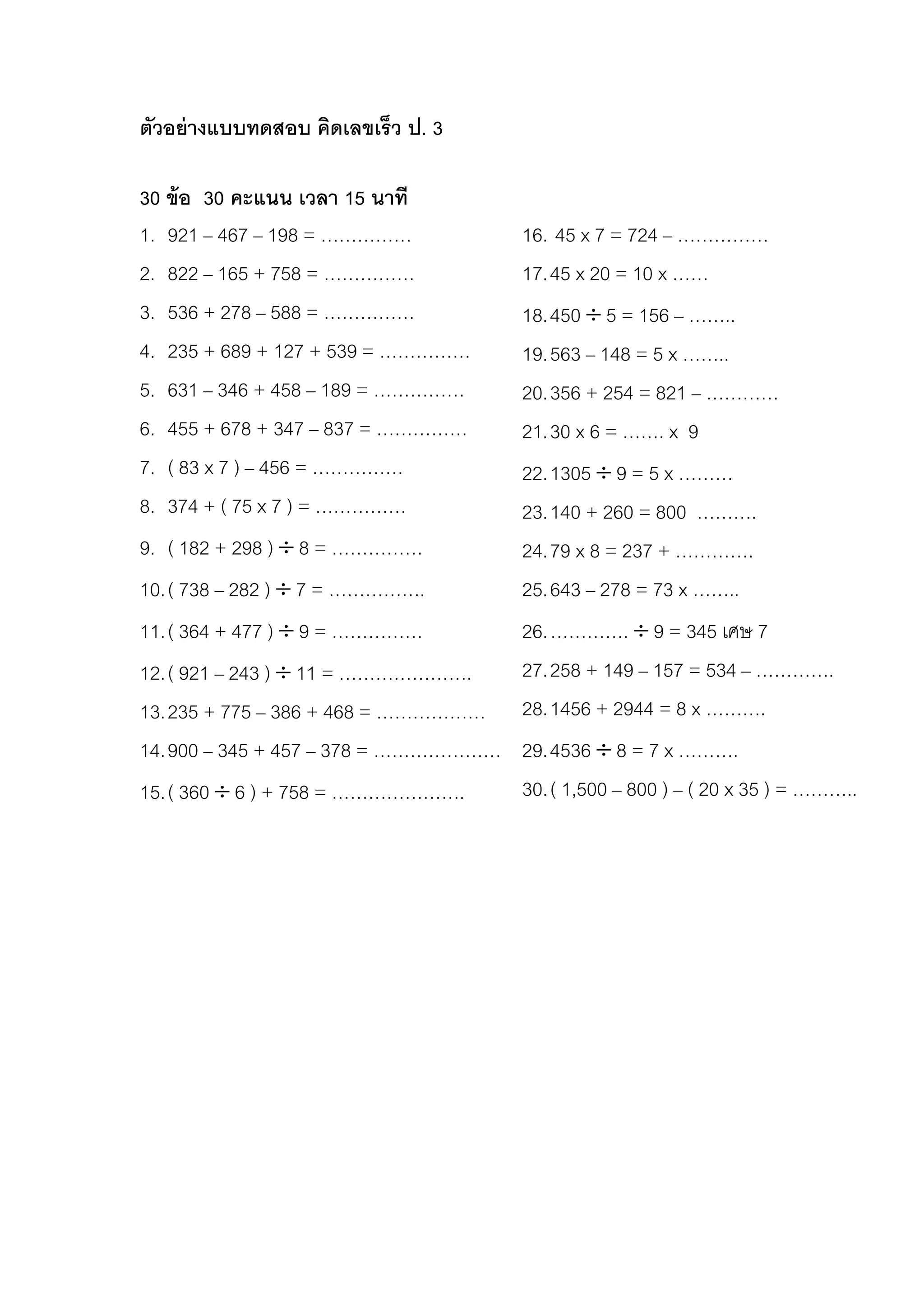แบบทดสอบคิดเร็วป.3 | PDF