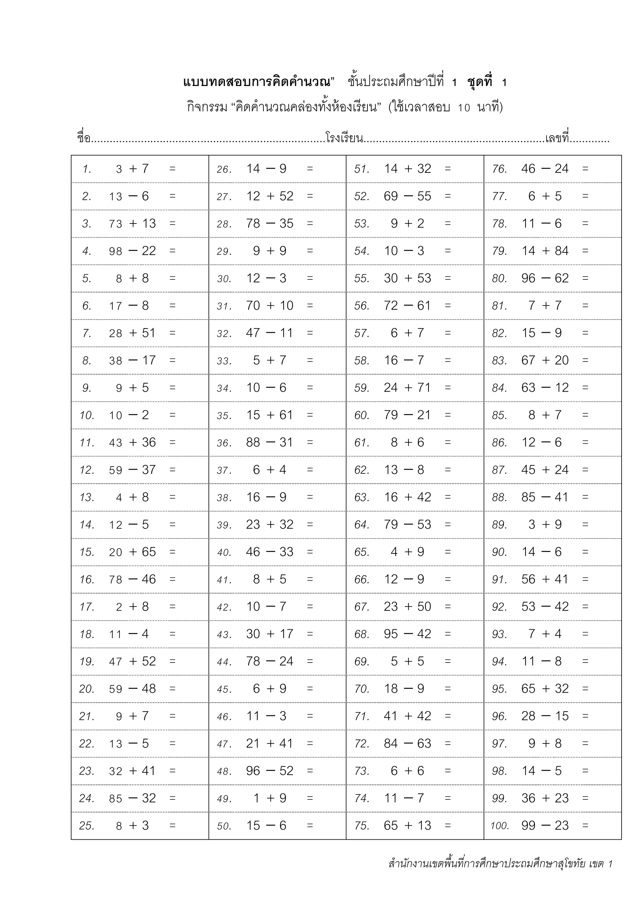 P1 แบบทดสอบคิดคำนวณคล่อง | PDF
