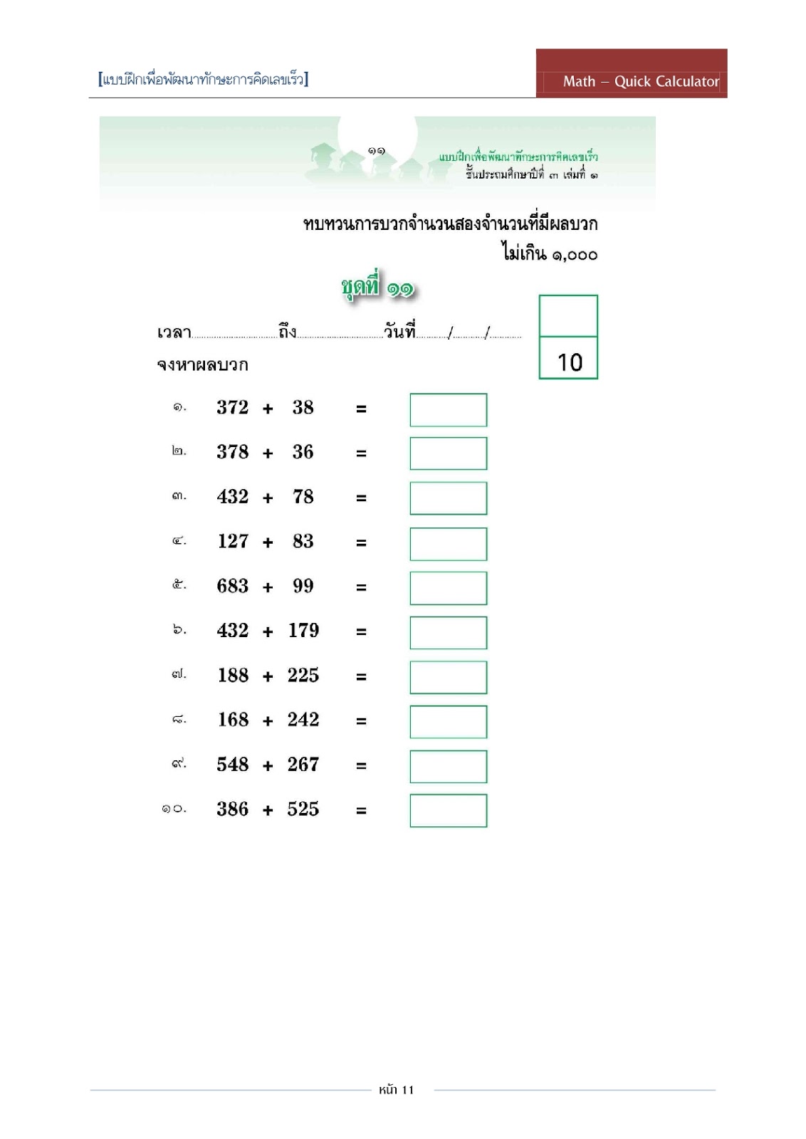 คณิตคิดเร็ว ป.3 คณิตศาสตร์ แบบฝึกหัด worksheet ชีทเรียน การบ้าน บวกลบ ...