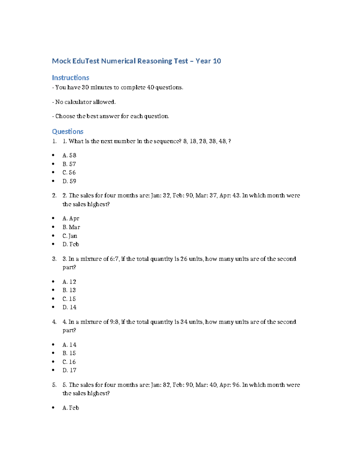 Mock EduTest Year 10 Numerical Reasoning Practice Questions - Studocu