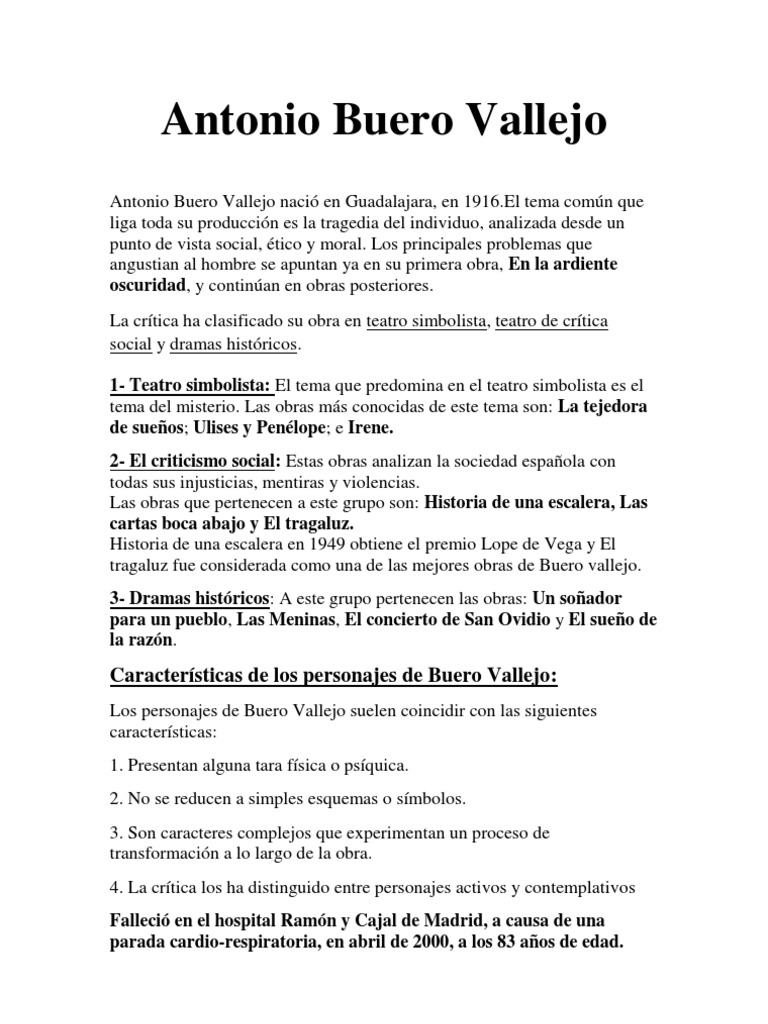 Resumen de Buero Vallejo- Literatura Castellano - Antonio Buero Vallejo ...