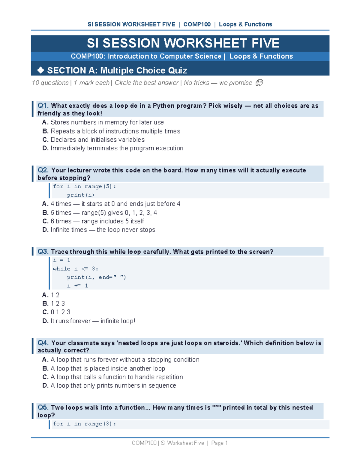 SI Worksheet Five COMP100: Loops and Functions Quiz - Studocu