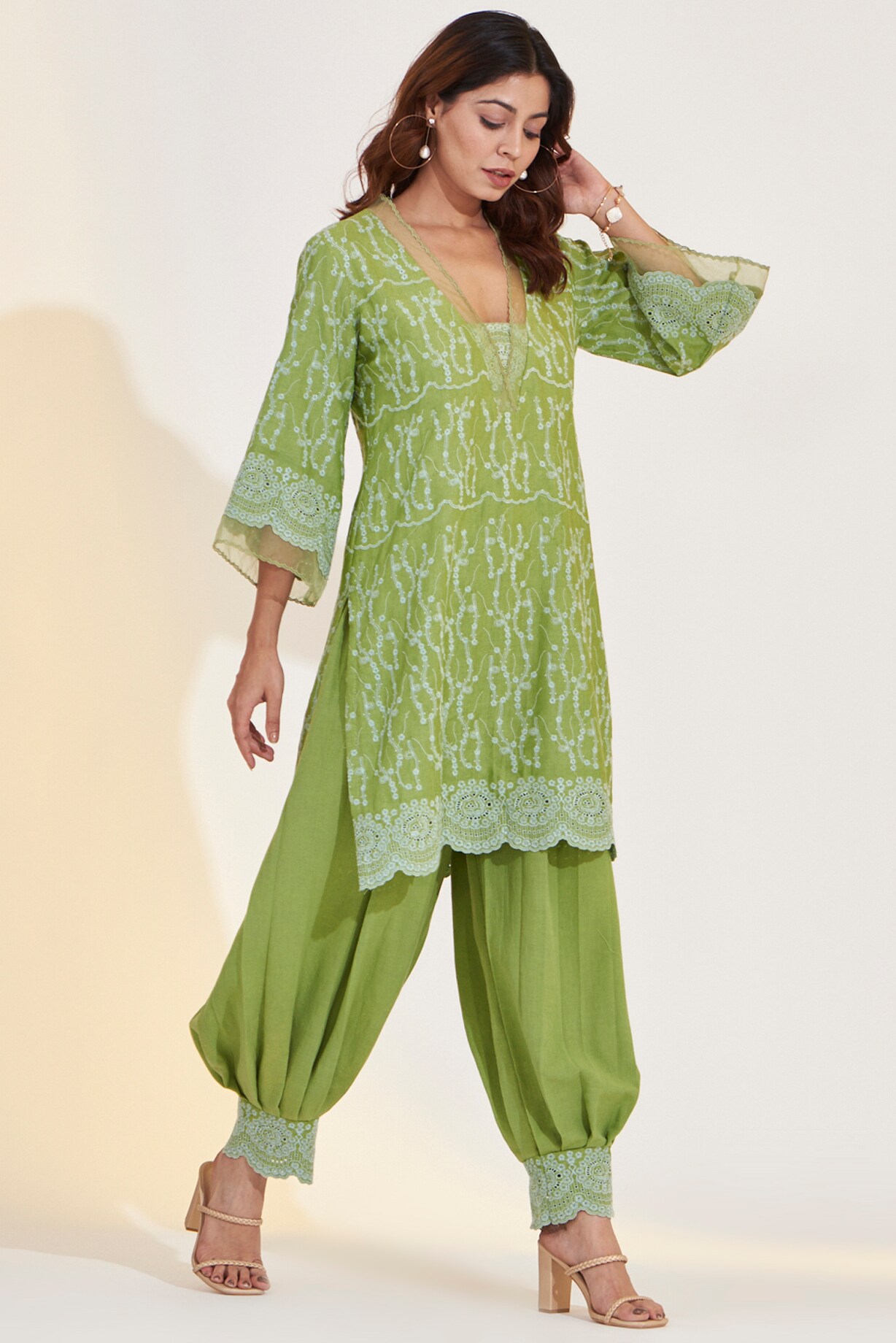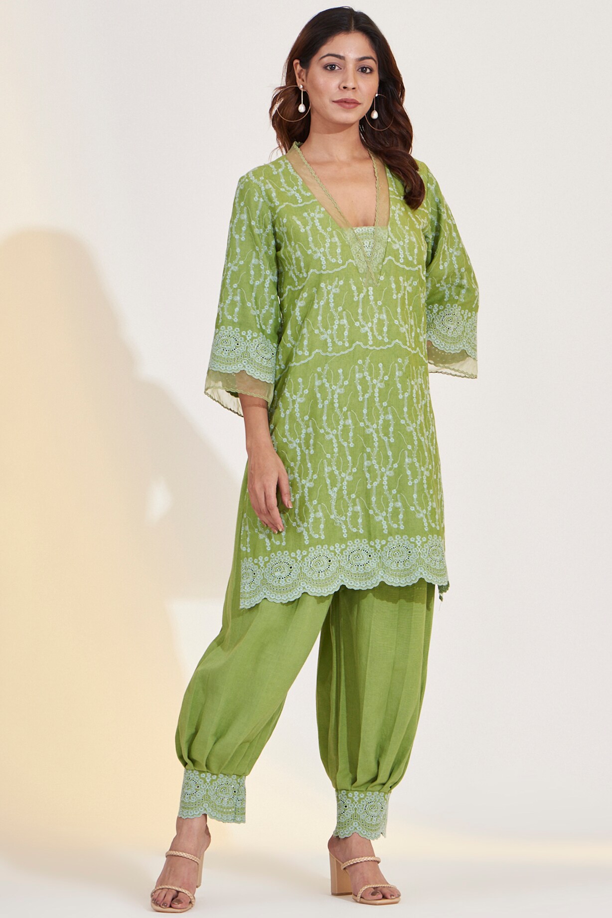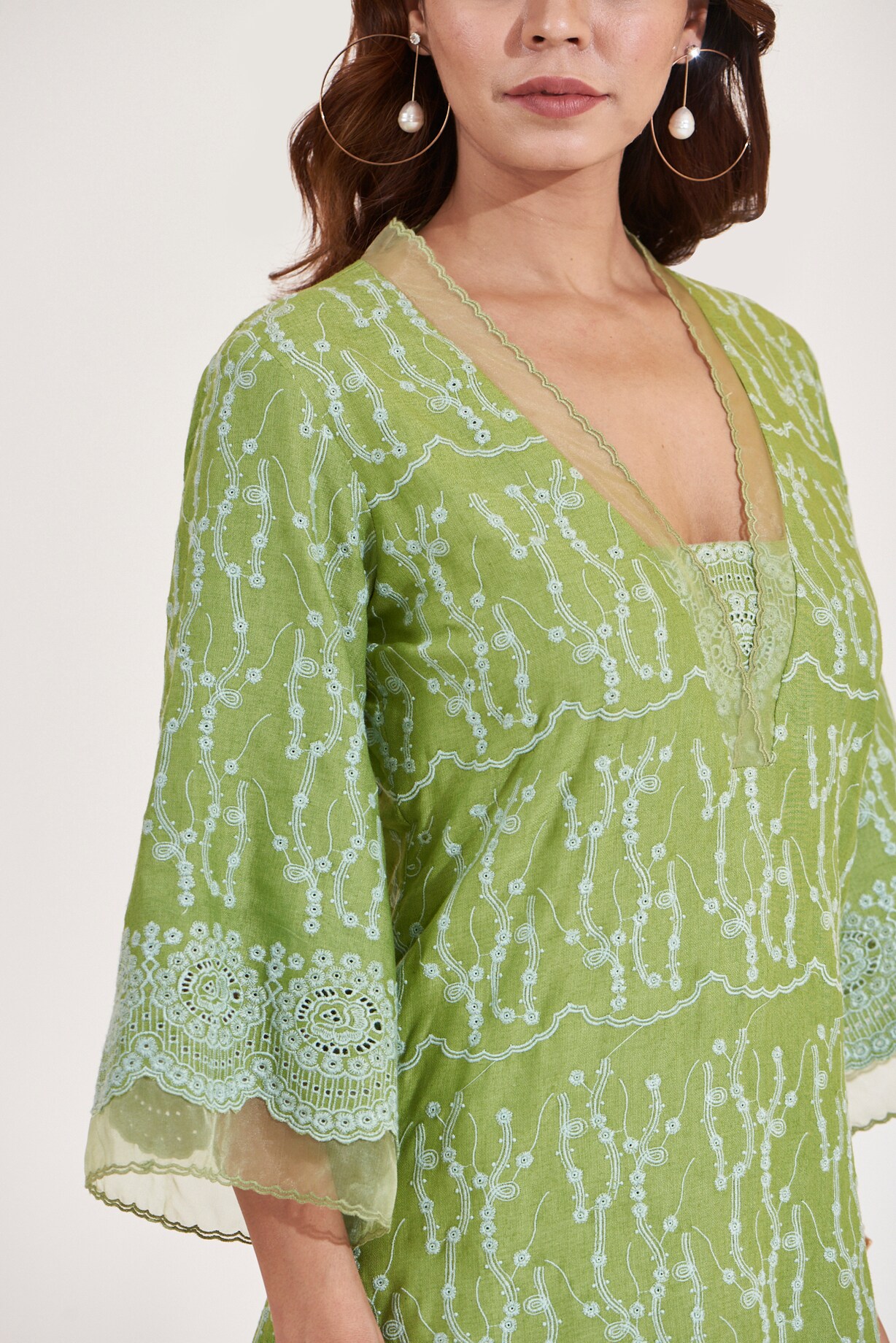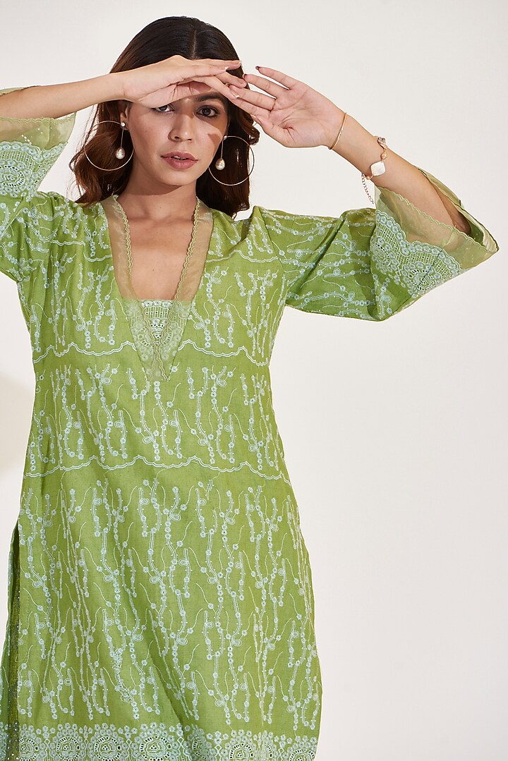 Mint Green Cotton Linen Embroidered Kurta Set by Glittire by Sakshi ...