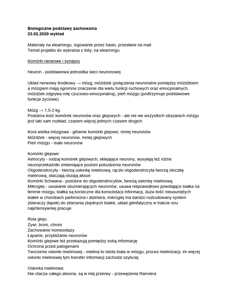 Biologiczna Podstawy Zachowania - Notatki Z Wykładów | PDF