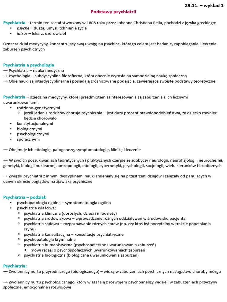 Podstawy Psychiatrii Notatki | PDF