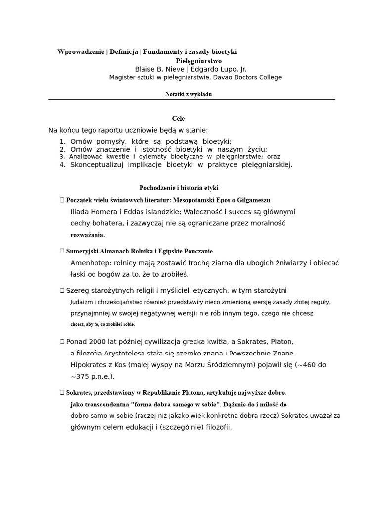 NOTATKI STUDENCKIE - Podstawy I Zasady Bioetyki W Pielęgniarstwie | PDF