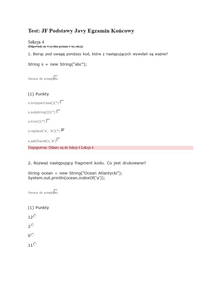 Sekcja Quizu 4: Podstawy Javy | PDF