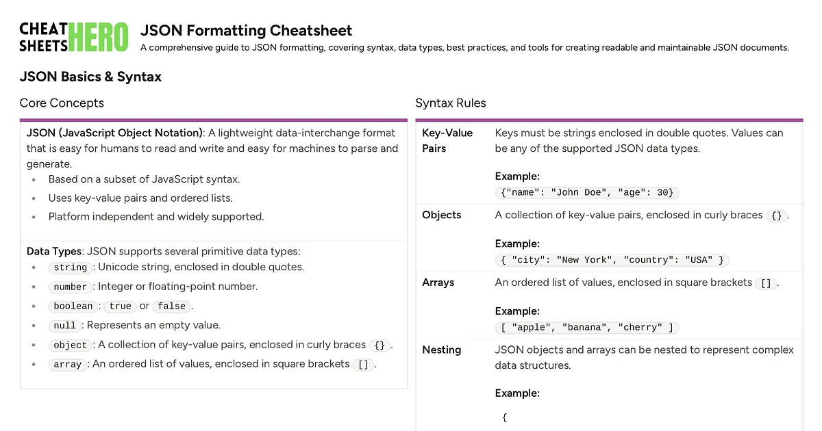 JSON Formatting Cheatsheet | Cheat Sheets Hero