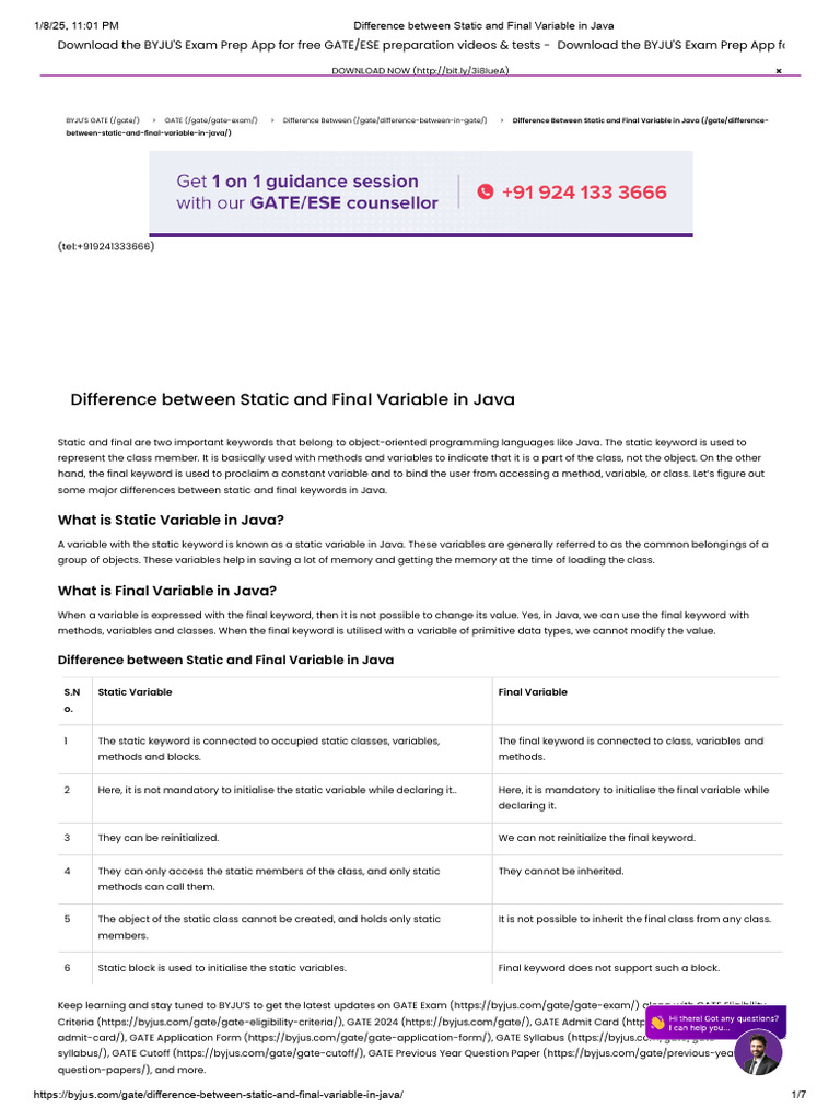 Difference between Static and Final Variable in Java | PDF | Variable ...