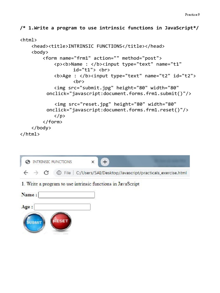 Based on this image's title: “1.write A Program To Use Intrinsic Functions in Javascript | PDF”