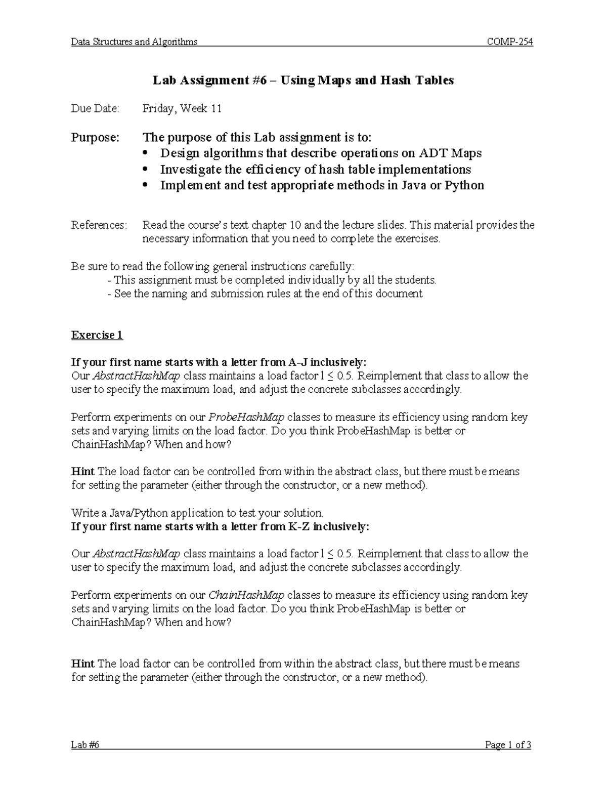 COMP254 Lab 6: Data Structures & Algorithms Using Maps and Hash Tables ...