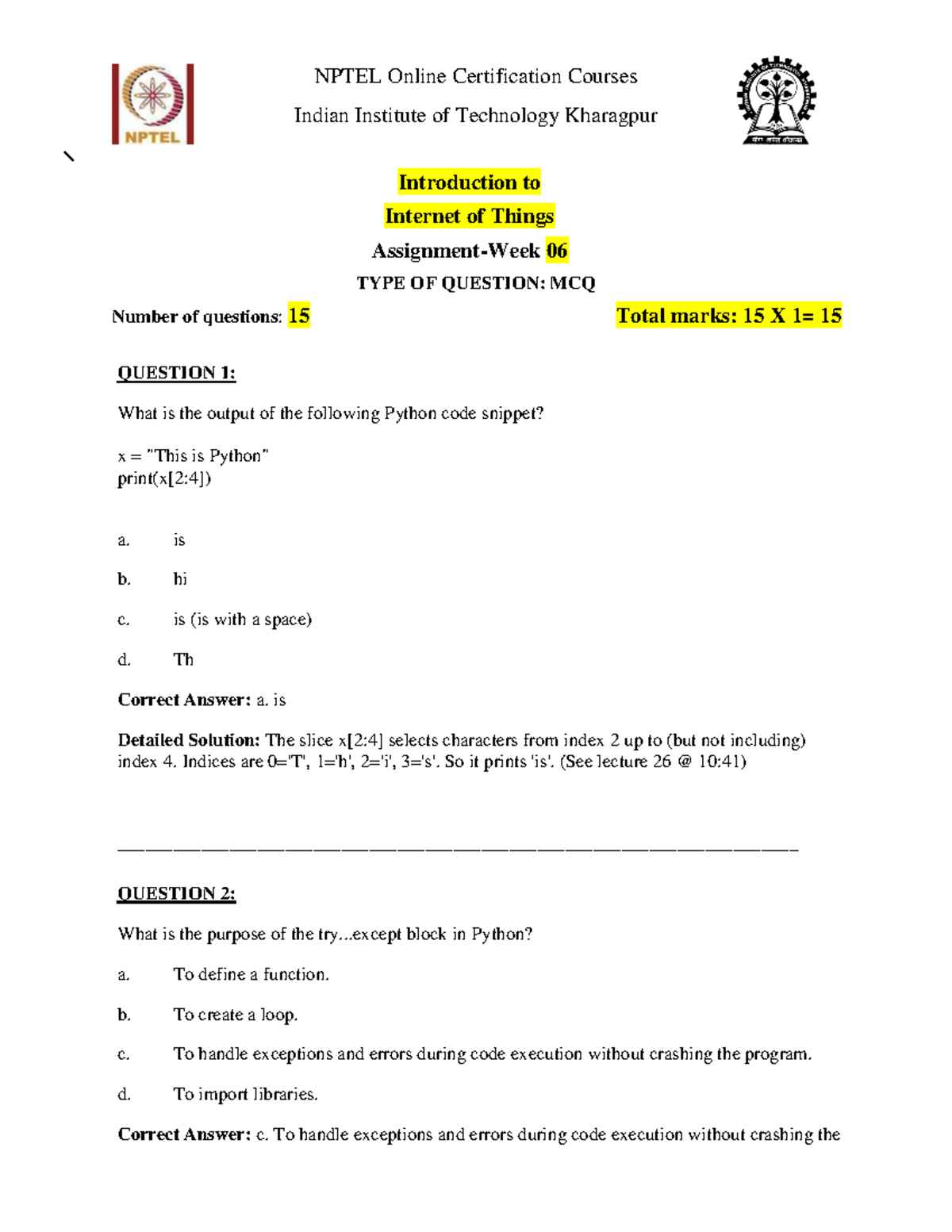 NPTEL IIT Kharagpur: IoT Assignment 6 Solutions (MCQ) - Studocu
