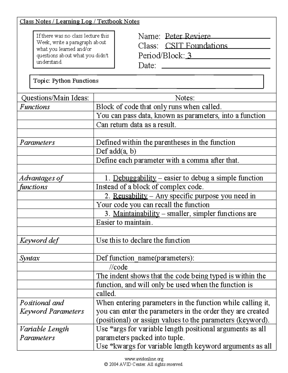 CSIT Foundations 3: Cornell Notes on Python Functions - Studocu