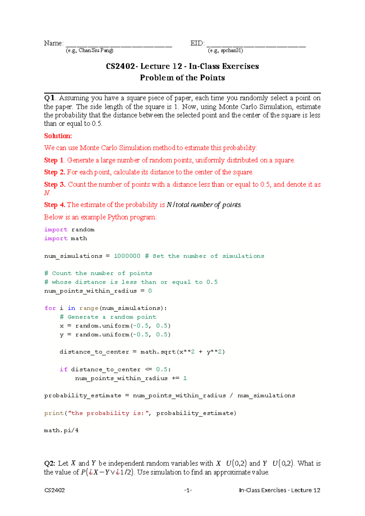 CS2402 Lecture 12 Exercises Solutions: Monte Carlo Simulations - Studocu