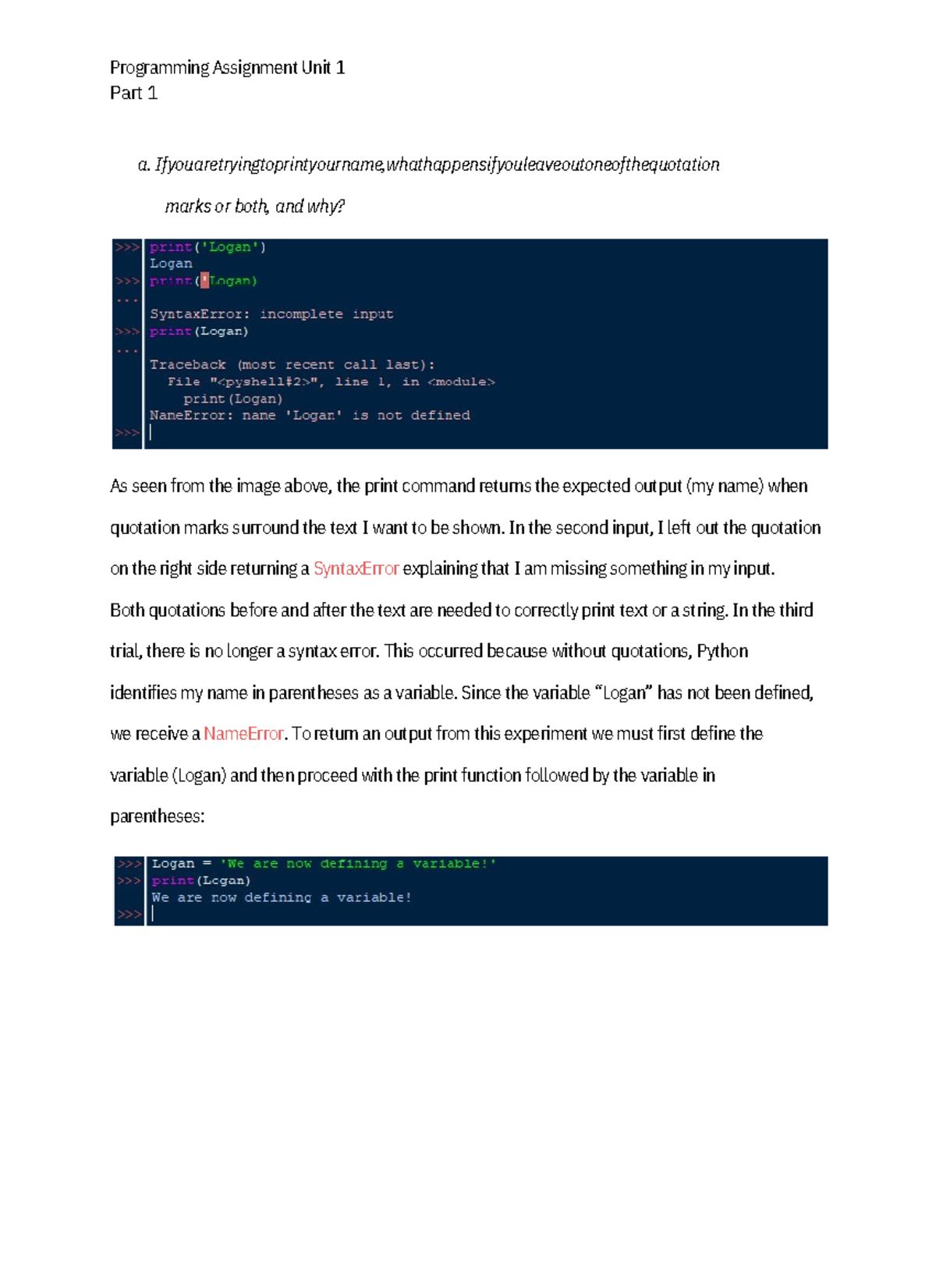 Cs 1101 programming Assignment Unit 1 - Part 1 As seen from the image ...