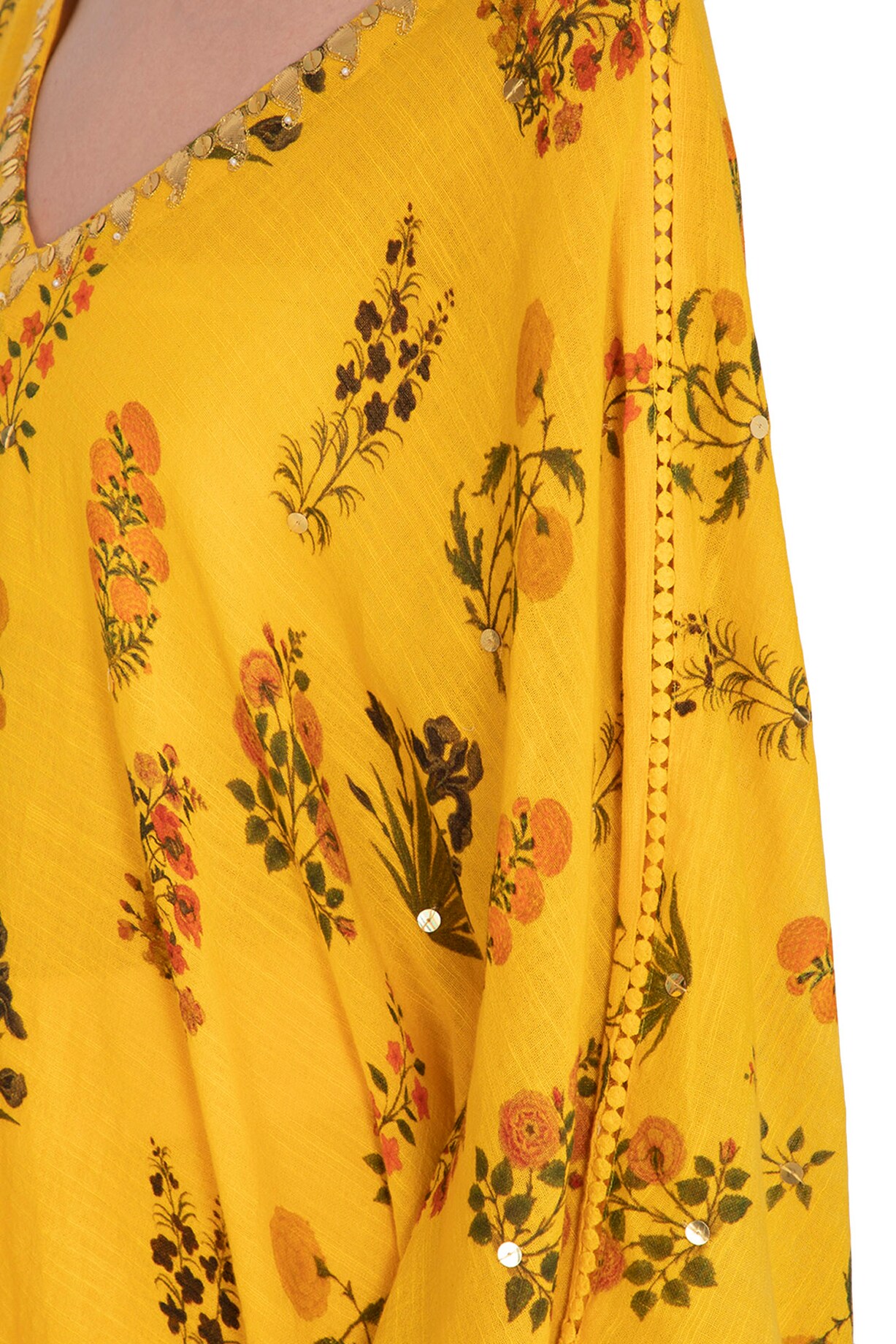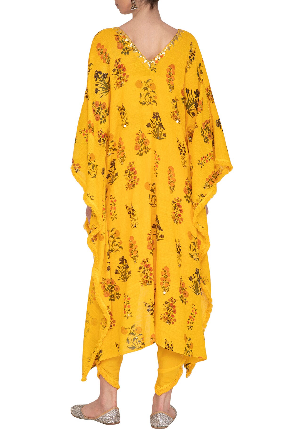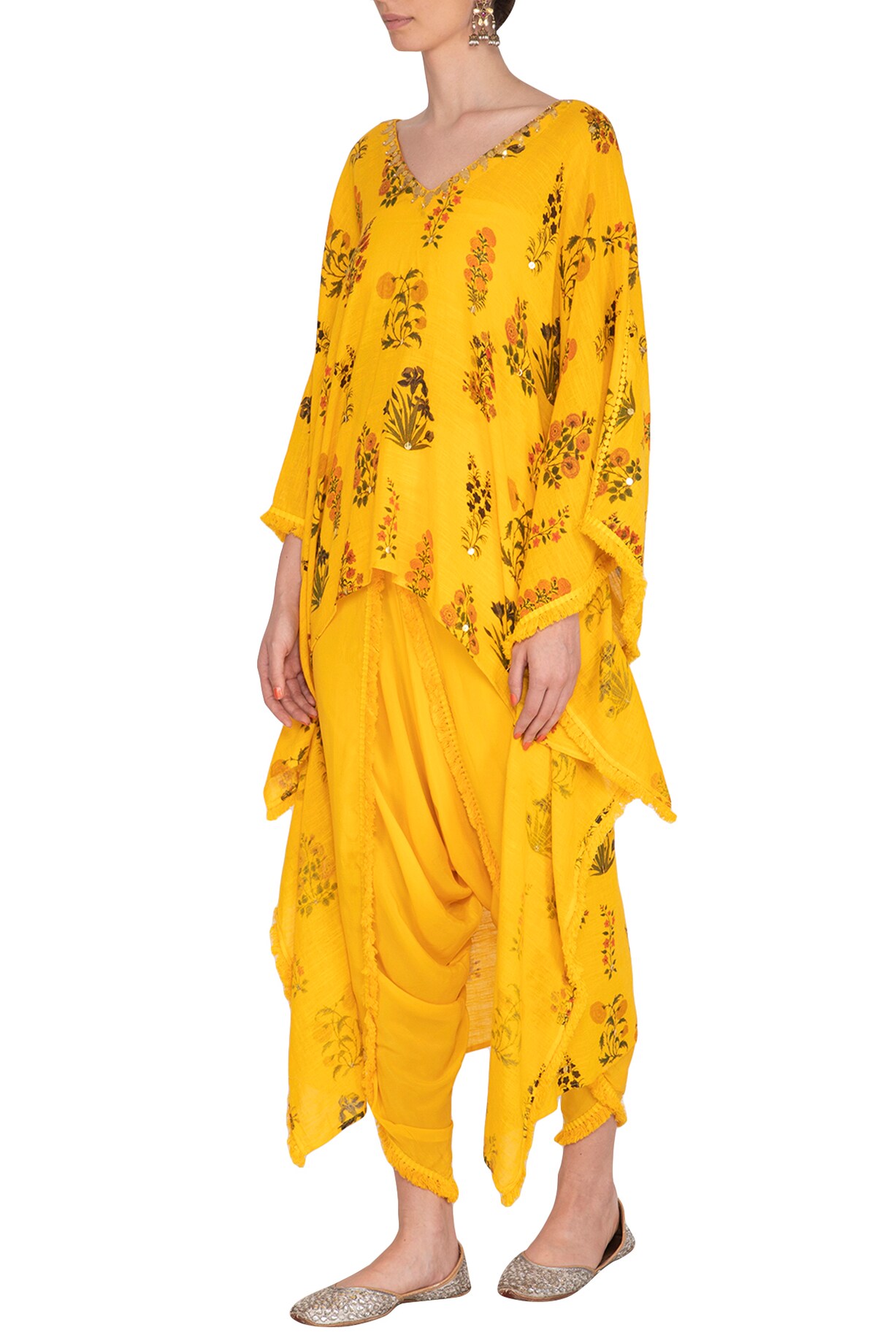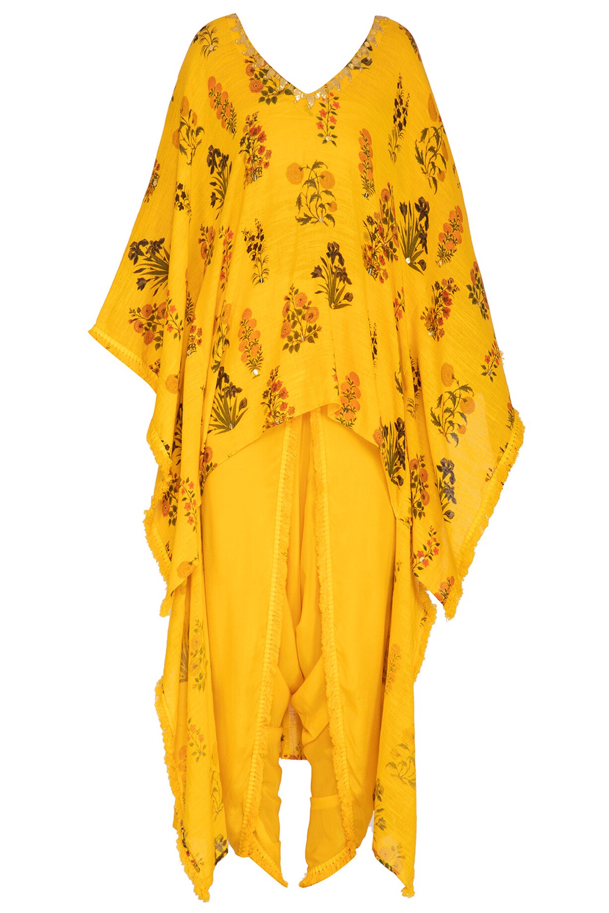 Yellow Printed & Embroidered Kaftan With Dhoti Pants by Ayinat By ...