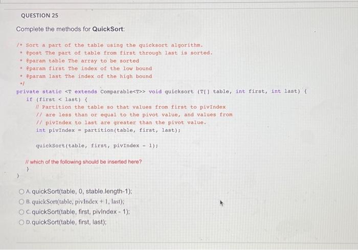 Solved QUESTION 25 Complete the methods for QuickSort: 1. | Chegg.com