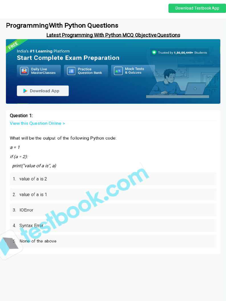 SOLUTION: Python MCQ's (Multiple Choice Questions) [2022] [PDF ...