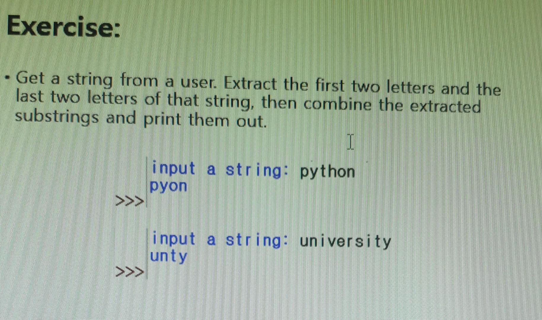 Based on this image's title: “Write a Python Program to Get a String Made of The First 2 And The Last ...”