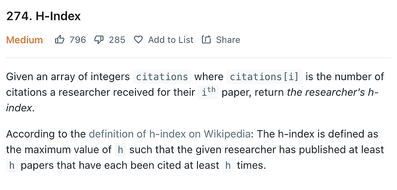 Leetcode 274. H-Index. 1. Problem description | by coderfromnineteen ...