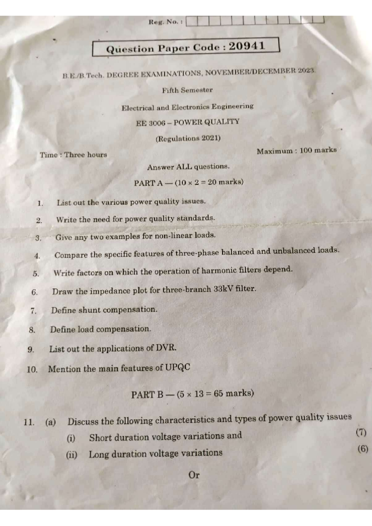 EE3006 Power Quality Final Exam Question Paper Nov 2023 - Studocu