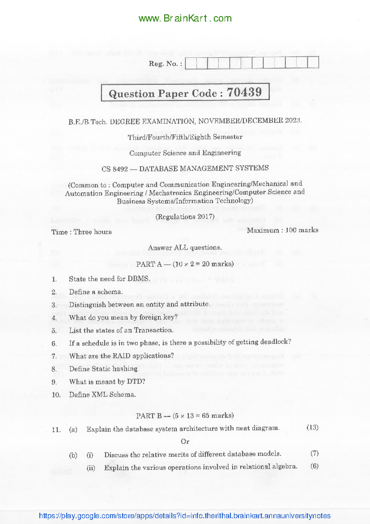 Database Management Systems - CS8492 Question Paper Nov-Dec 2023 - Studocu