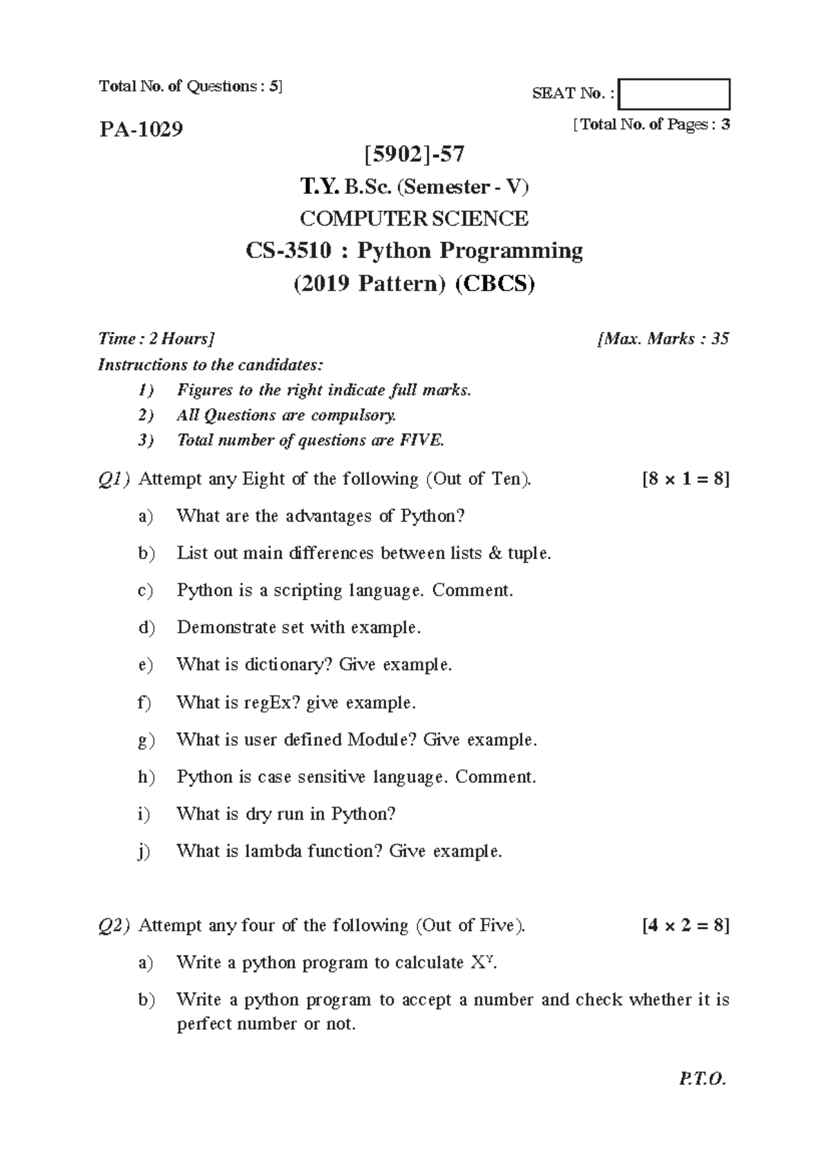 CS-3510 Python Programming Question Paper - T.Y. B.Sc. (Sem V) - Studocu