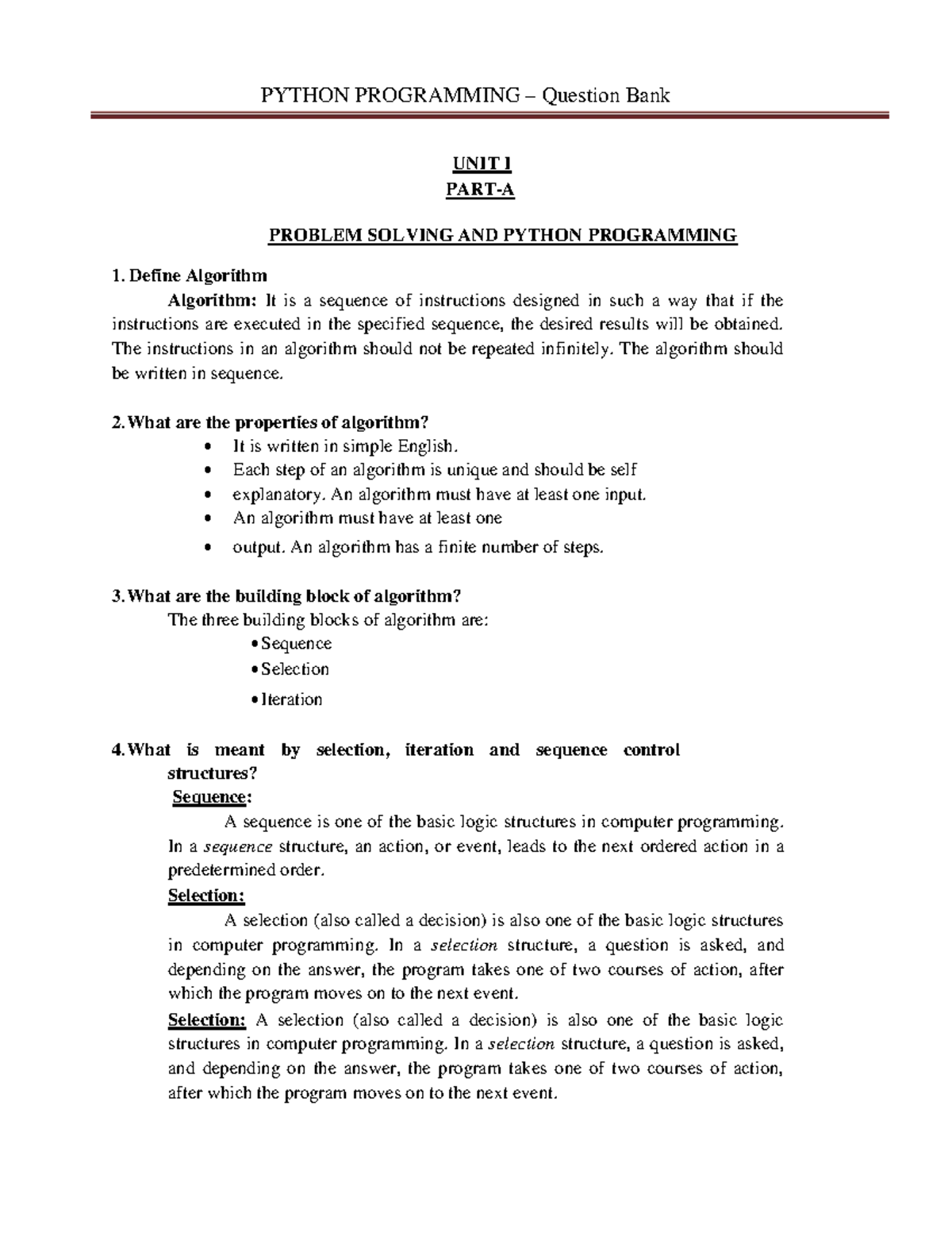 PYTHON PROGRAMMING Question Bank: Unit I - Problem Solving & Concepts ...