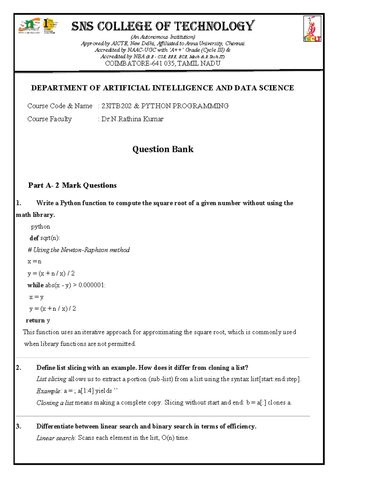Python Programming Question Bank - B.Tech. (CS AI) - Studocu