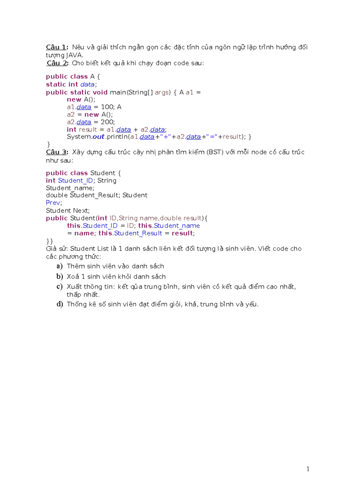 ÔN TẬP CUỐI KÌ LẬP TRÌNH JAVA - CÁC ĐẶC ĐIỂM VÀ CÂU HỎI THỰC HÀNH - Studocu