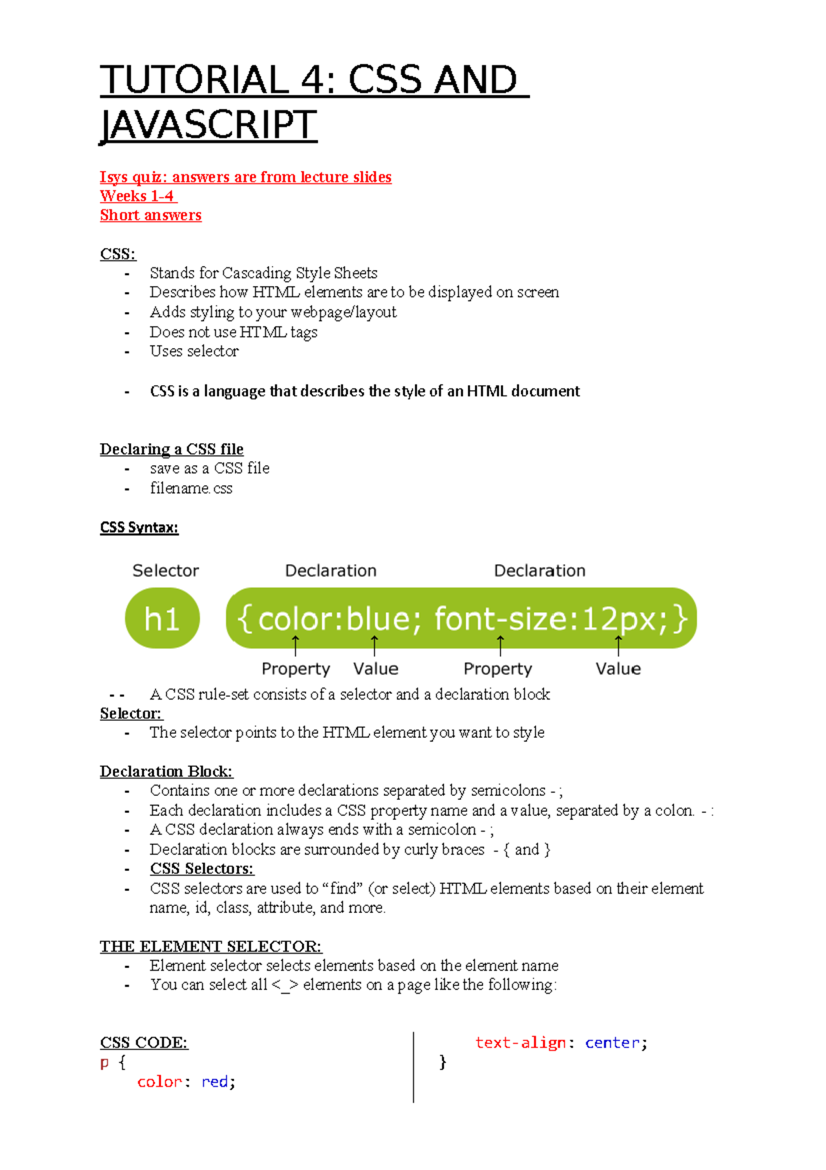 Tutorial 4 - TUTORIAL 4: CSS AND JAVASCRIPT Isys quiz: answers are from ...