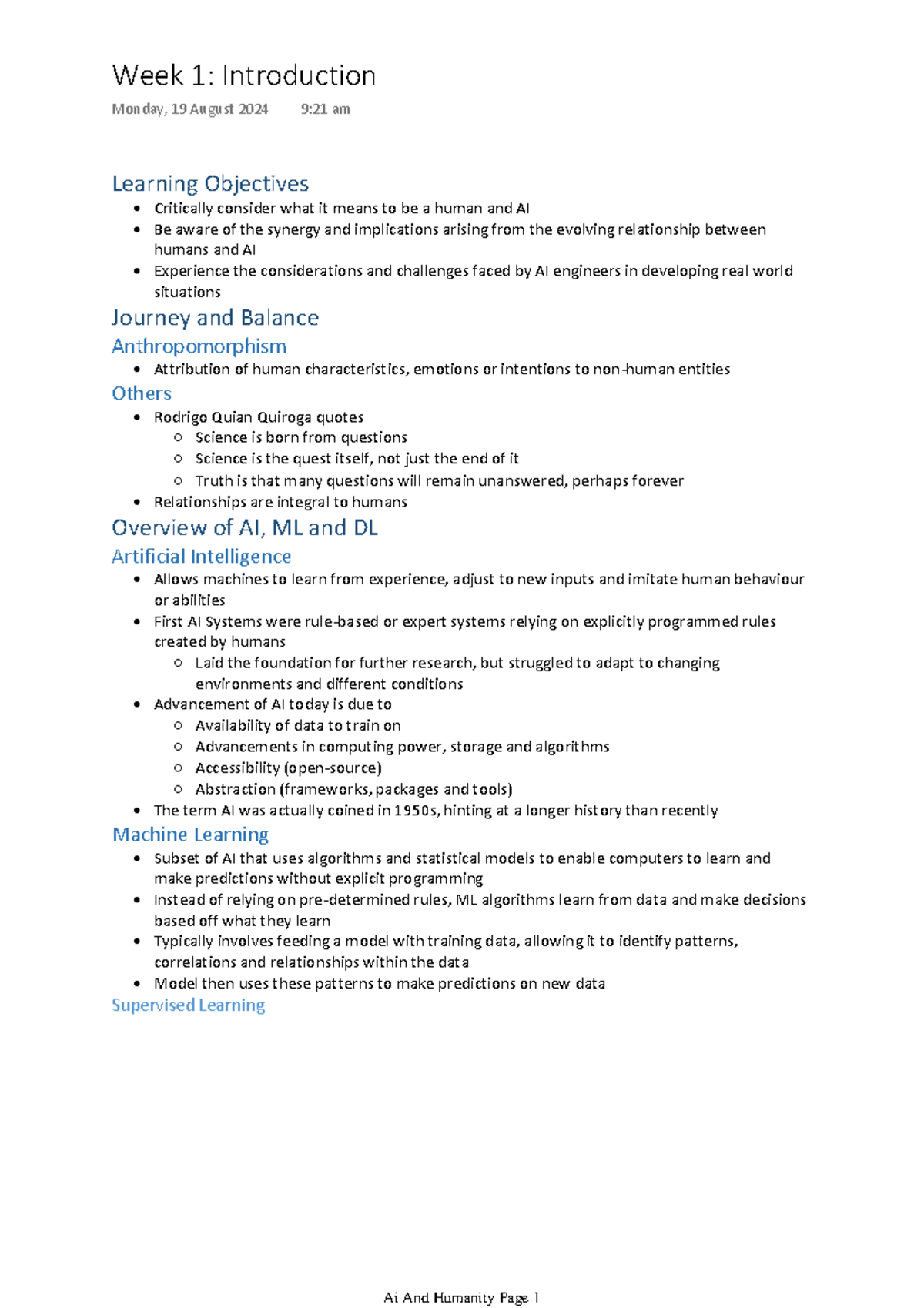 Week 1 Introduction - Notes for AIH week 1 lecture - Learning ...