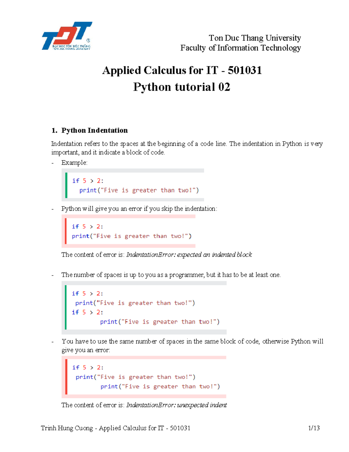 Applied Calculus for IT 501031: Python Tutorial 02 - Indentation ...