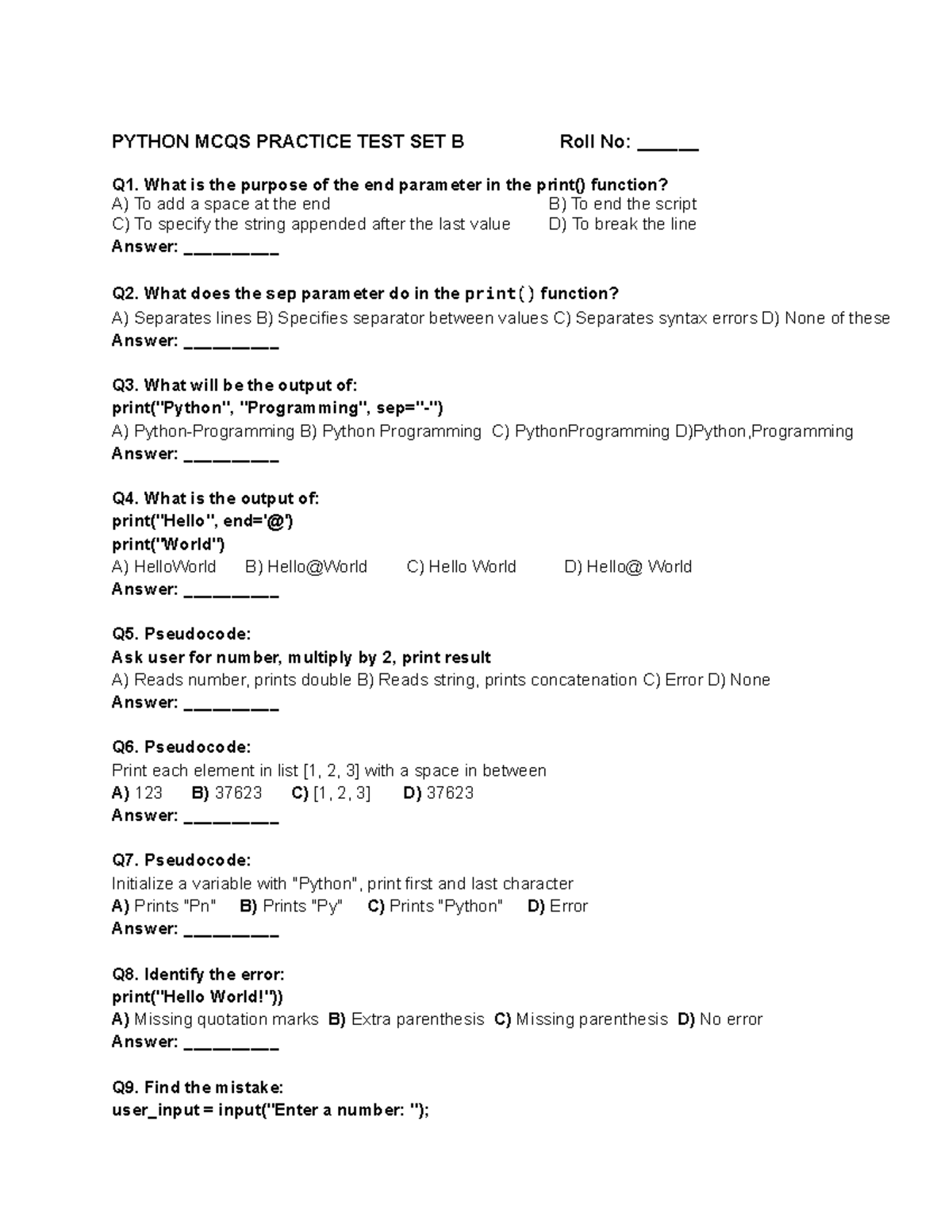 SET B - Hello from this document - PYTHON MCQS PRACTICE TEST SET B Roll ...