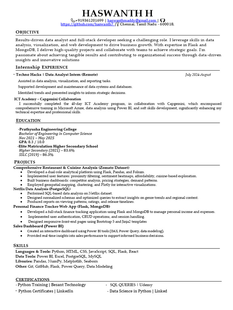 Haswanth H BE CSE 2025 Python Developer | PDF | Postgre Sql | Data