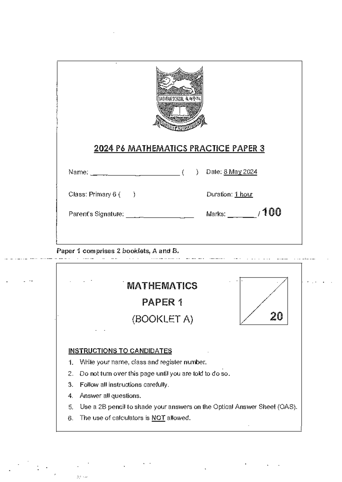 2024 P6 Mathematics Practice Paper 3 - Studocu