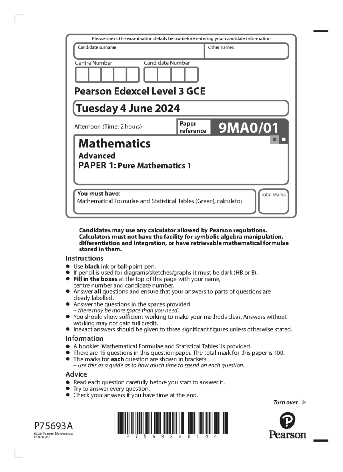 Mathematics Advanced 9MA0/01 Final Exam Paper 1: Pure Mathematics 2024 ...