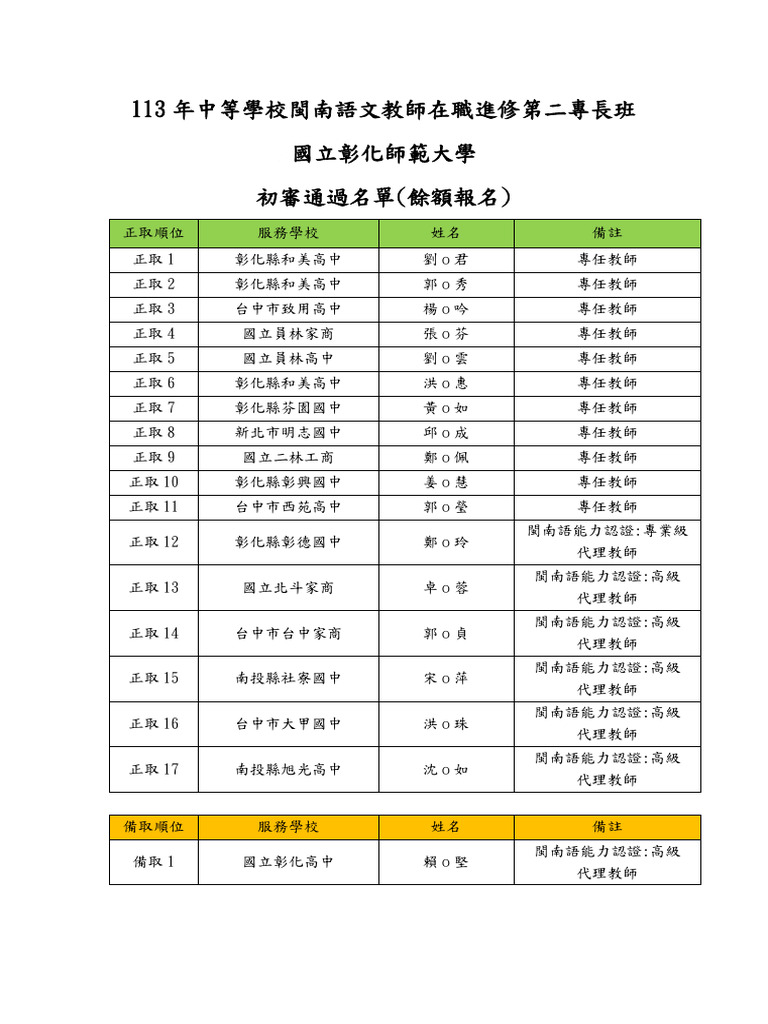 (餘額報名) 初審通過名單 113年閩南語文第二專長班 | PDF
