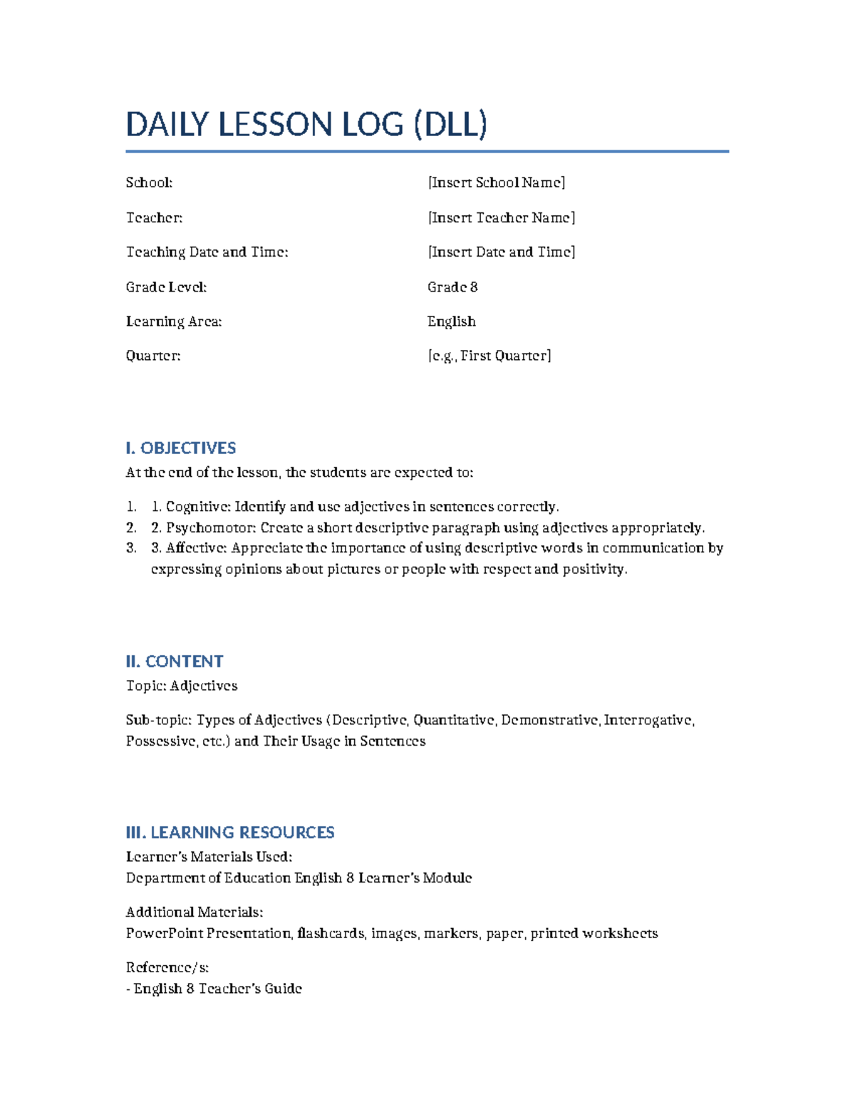 Adjectives Lesson Plan for Grade 8 - Daily Lesson Log (DLL) - Studocu