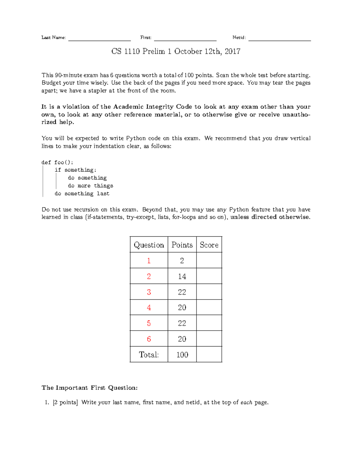 2017-fall-prelim 1 - Past Prelim 1 from CS 1110 taught by Professor ...