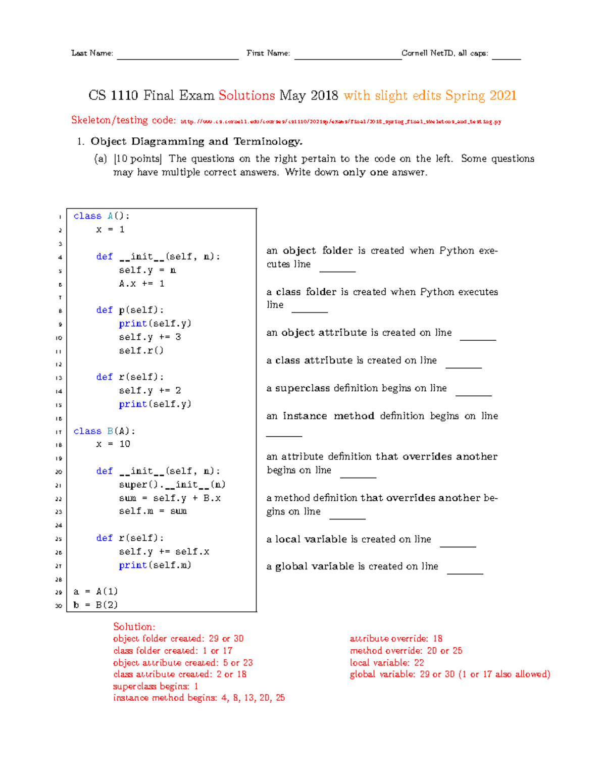 2021 spring final answers - CS 1110 Regular Final Solutions May 2021 ...