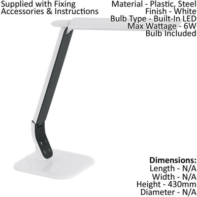 Table Desk Lamp White Steel Black Plastic Touch On/Off Bulb LED 6W Included