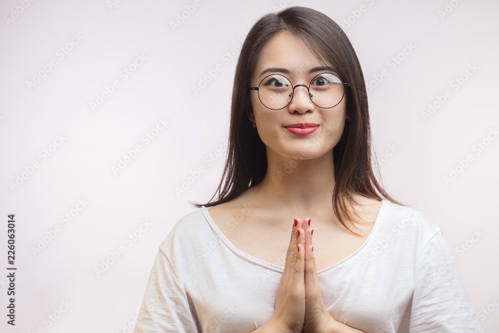 Asian woman with long hairs, wearing optical spectacles, holding hands ...