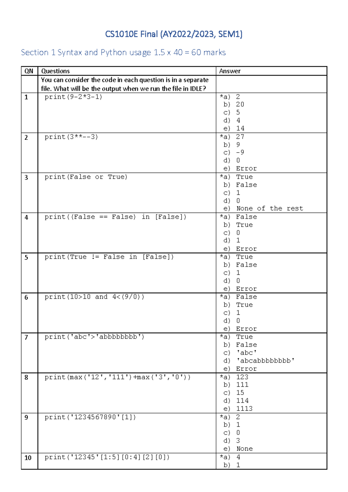 CS1010E Final Exam SEM1: Python Syntax & Code Output Analysis - Studocu