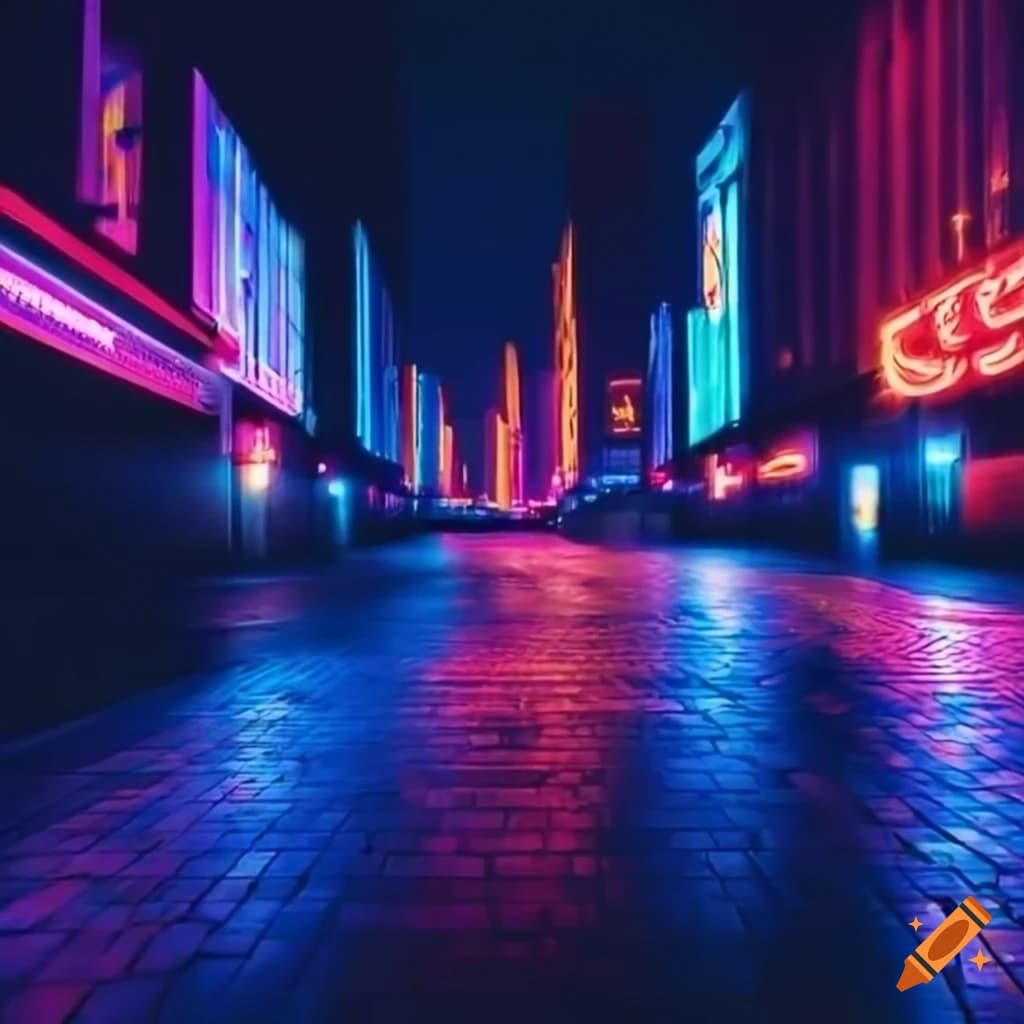 A close up of a city street with neon lights and buildings - SeaArt AI