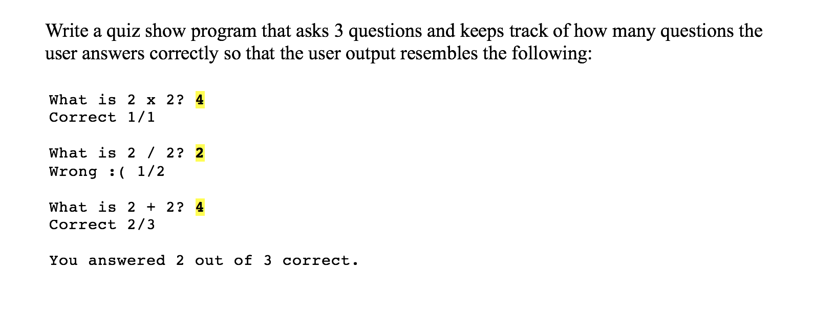 Solved Write a quiz show program that asks 3 questions and | Chegg.com