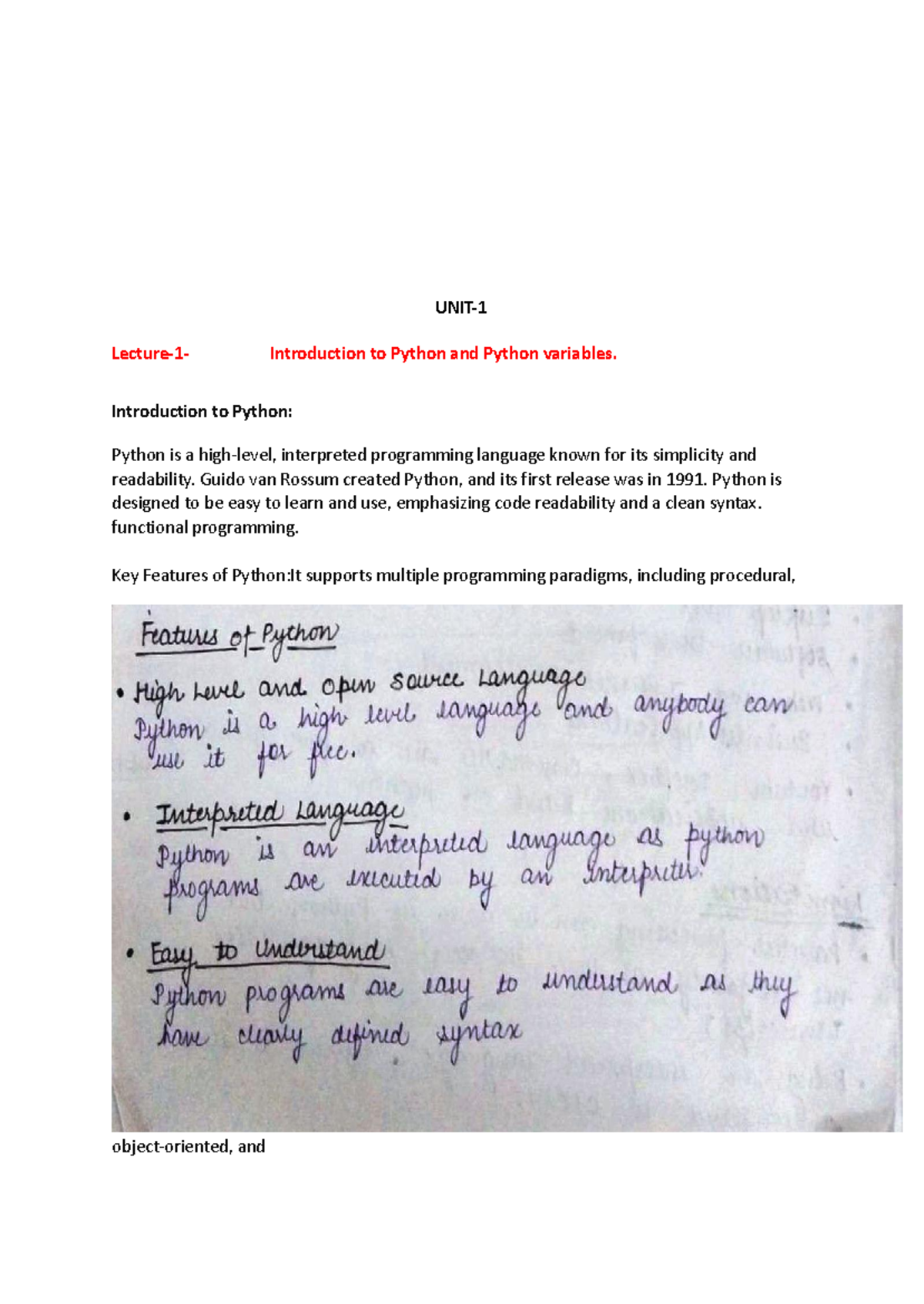 Python unit 1 - UNIT- Lecture-1- Introduction to Python and Python ...