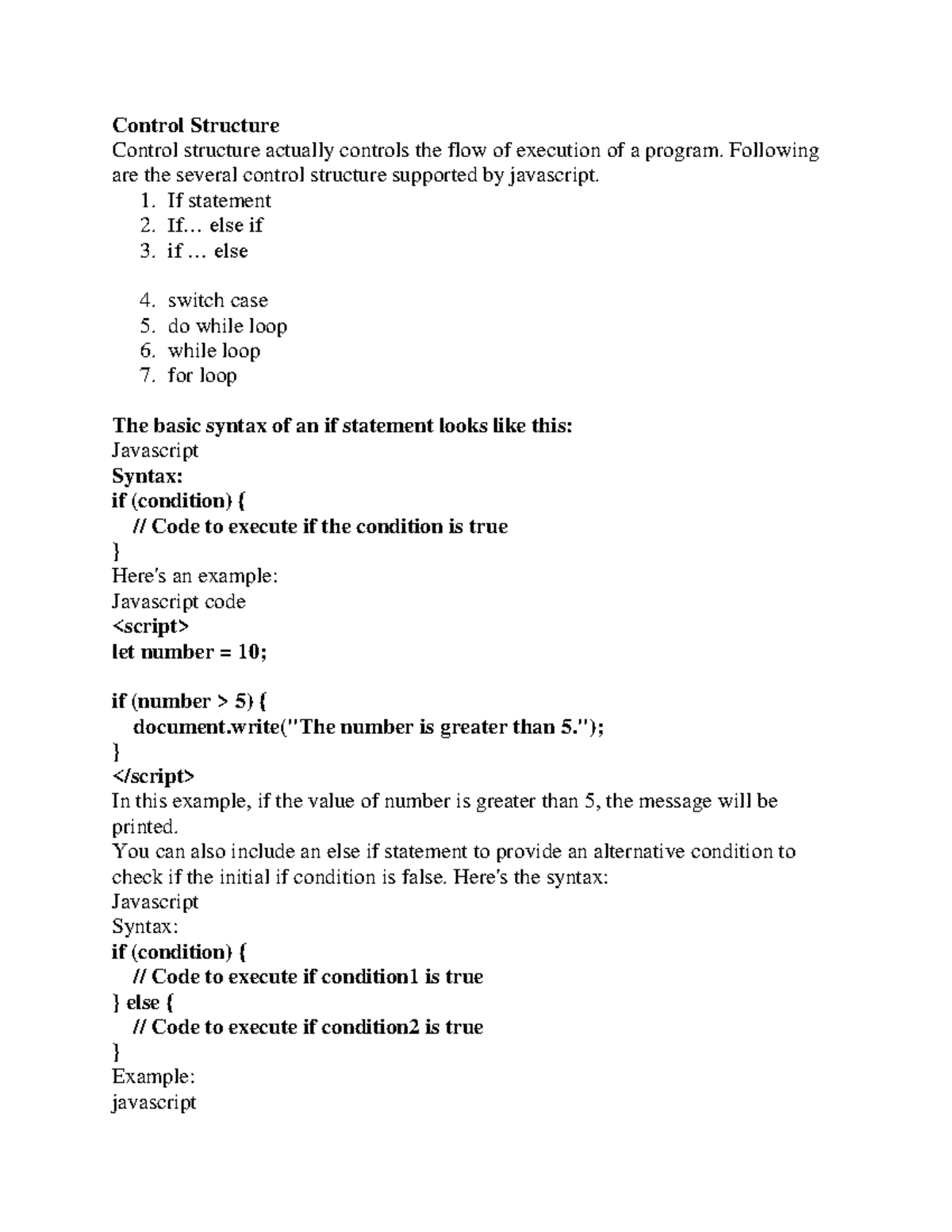 JavaScript Control Structures: If, Loops, and Functions (CS101) - Studocu