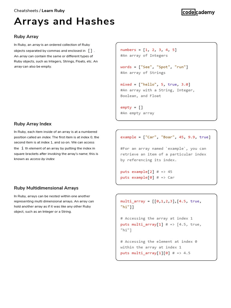 Learn Ruby - Arrays and Hashes Cheatsheet - Codecademy | PDF | Bracket ...